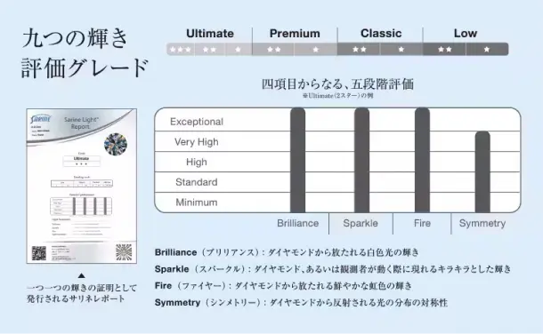 輝きの評価システムとは、内包物の位置・ダイヤモンドの色など、様々な要因で少しずつ異なるダイヤモンドの輝きを、どれだけ輝いているか定量的に評価するものです。「銀座ダイヤモンドシライシ」が仕入れる研磨済みダイヤモンドの99%は、最高評価Ultimate(ウルティメイト)のダイヤモンドであることが証明されています。